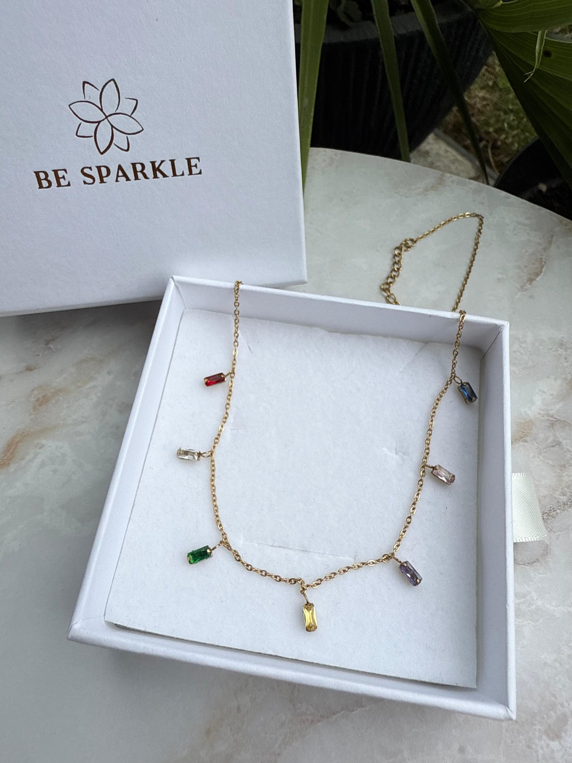 Die Luna Kette besticht durch sieben Anhänger, die mit Zirkonia in verschiedenen Farben besetzt sind. Diese Kombination verleiht dem Schmuckstück eine elegante Vielseitigkeit und sorgt für funkelnde Akzente am Hals. Die hochwertige Vergoldung garantiert Langlebigkeit und einen edlen Look, ideal für anspruchsvolle Trägerinnen, die Wert auf stilvolle Details legen.
