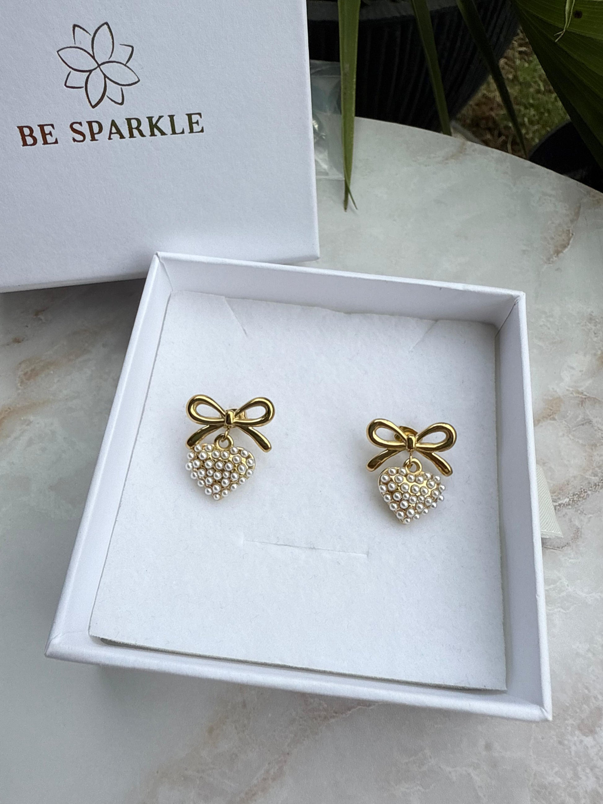 Die Olivia Ohrringe verbinden filigrane Eleganz mit verspieltem Charme. Kleine Schleifen setzen einen zarten Akzent, während der Herzanhänger mit Perlen für eine edle Note sorgt. Dieses besondere Design eignet sich ideal, um jedem Outfit eine feminine und stilvolle Ausstrahlung zu verleihen.