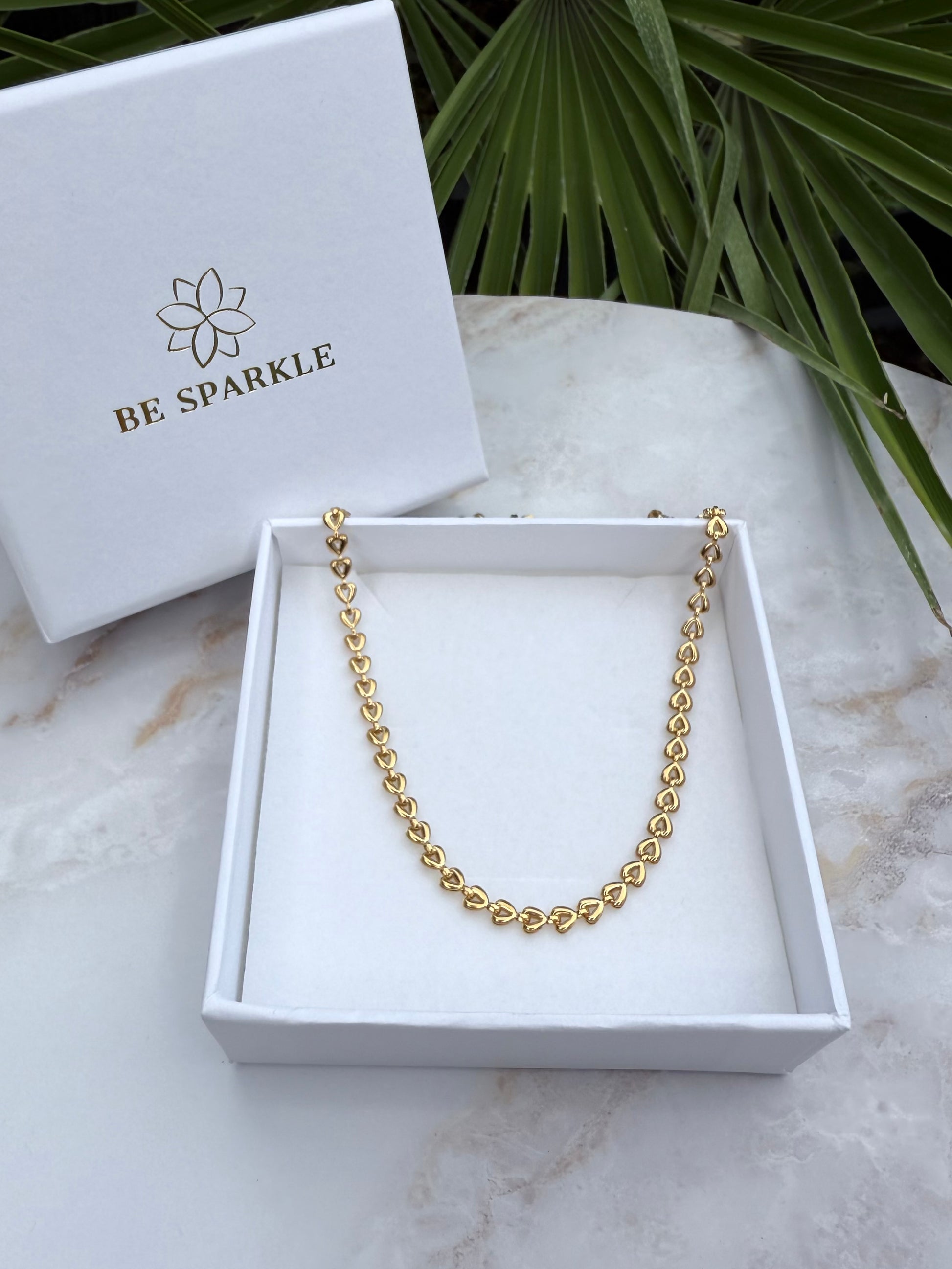 Die Tia Kette besticht durch ihre zierliche Gliederkette aus winzigen Herzen, die Eleganz mit romantischem Charme verbindet. Jedes kleine Herz ist sorgfältig verarbeitet und schafft ein verspieltes, liebevolles Design, das perfekt zu deinem alltäglichen Look passt. Die feine Verarbeitung macht diese Kette zu einem vielseitigen Accessoire – ob solo getragen oder kombiniert mit anderen Schmuckstücken. Ein Hauch von Zärtlichkeit für jeden Tag, der dich zum Lächeln bringt.